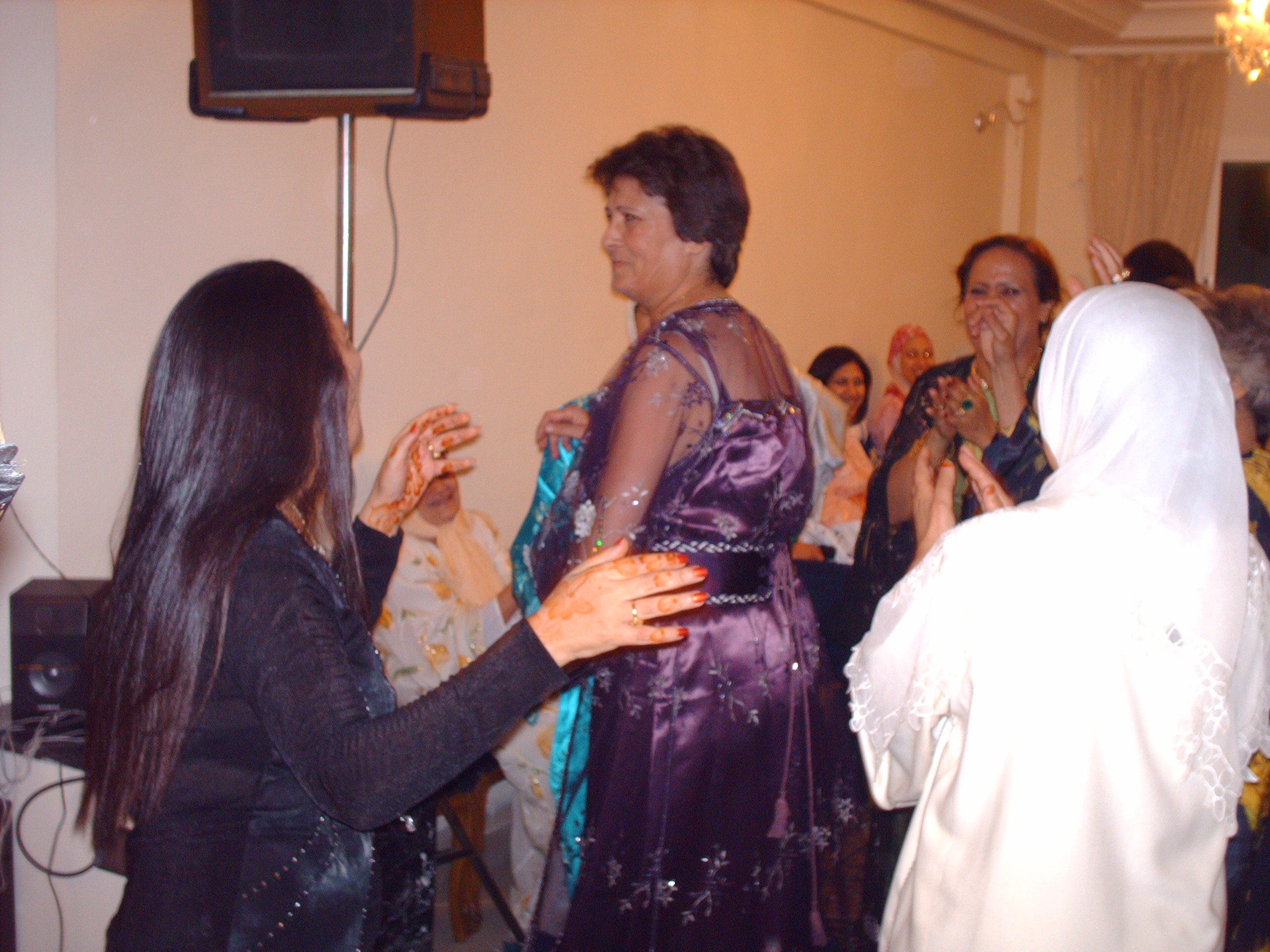 Je peux vous dire dans mon costume de marier javais tres chaud, a vrai dire je me sentais etouffer et je transpirais enormement. Une chance qu il y avais une dame la maman a Amine et Fadwa pour etre la pour moi car je croyais ne pas men sortir avec cette chaleur. Tout les gens dansais surtout les femmes je ne sais pas pour quoi mais tous sans exception son des danseuses extraordinaire et moi je les admirais danser c etais tellement beau a voir.