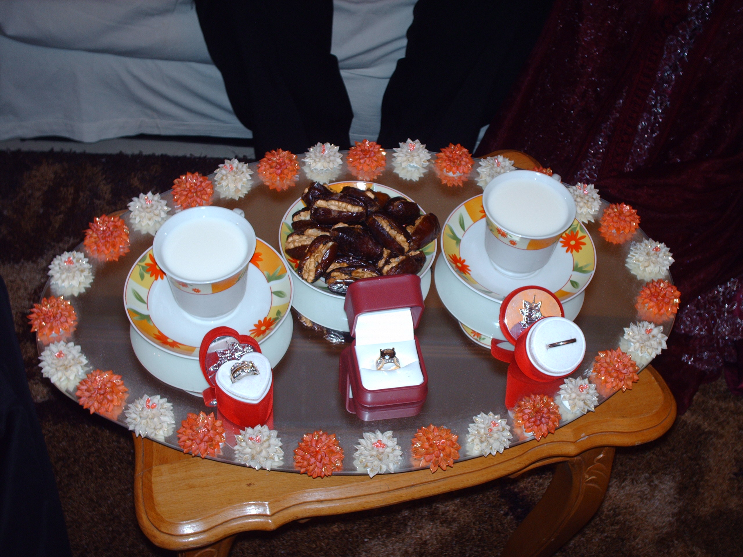 Il y a eu dans la soiree l'echance des alliances. nous avons du manger un morceau de date et echanger une gorger de ver de lait(coutume marocaine). Je ne peu m empecher egalement de vous parler du gater il etai oui tres bon mais surtout tres beau.